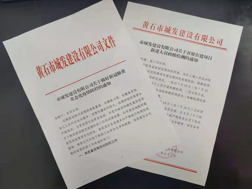 鑒于項目工地人員密集,流動性大的特點,8月5日,公司印發(fā)了《市城發(fā)建設(shè)有限公司關(guān)于開展在建項目新進(jìn)人員核酸檢測的通知》,為切實擔(dān)負(fù)起防疫抗疫責(zé)任,有效降低人員流動引發(fā)的疫情傳播風(fēng)險,要求7月20日以來新進(jìn)項目員工須持3日內(nèi)合格核酸報告進(jìn)入項目工地。